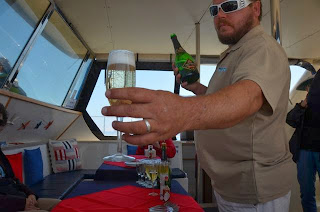 We watched Barbara's port talk yesterday and she was so excited about the Seal and Dolphin excursion that we decided to join her in the fun. Great tour and great fun as Suckey the seal jumped right up onto the Catamaran trampoline area at the front of the boat. We had visiting Pelicans, Sea Gulls along with other birds landing on our boat looking for a few handouts. We were in area on the bay that is home to some 27,500 seals, apparently there are over 3.5 million seals in Namibia, human population is just over 2 million (our guide was happy that seals are not allowed to vote). Over to the next area were the Dolphins gliding gracefully through the water. Then it was time for a served lunch including the best oysters I have ever had. This along with open faced sandwiches, spring rolls and many different other finger foods. To drink, well the day started off with coffee, then switched to Sherry (a good 11 0'clock in the morning blend), then to Namibian beer and finally Champagne, it was a wonderful day on the water.
