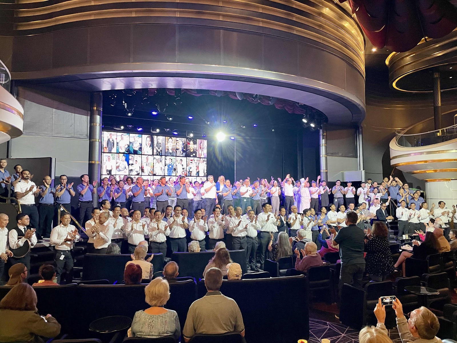 We very much enjoy taking part of the last day and captain presentation on the last day of a cruise, especially the longer cruises. It is always great to see the many crew that you get to know up on stage saying their goodbyes and that hopefully you see them soon on another Dam ship. At the end of the day, there are many reasons why we always return to HAL, it’s not only the smaller ships and itineraries but really is the crew, from the captain down. Captain Mark Trembling runs a great ship here on the Westerdam, he is one of the best if not the best in communicating events as they happen. Most of the guests on this cruise are experienced cruisers and instinctively know when something changes. This could be ship speed, wave action or demeanours of officers and crew etc.. On his next noon update, Captain Mark will talk about pretty much any and all issues. On this cruise this included amongst many other things but the threat of a possible typhoon, a couple of port and docking delays, to why the ship has still not been cleared, to a port that required tendering rather than docking. Great job to Captain Mark and his team.