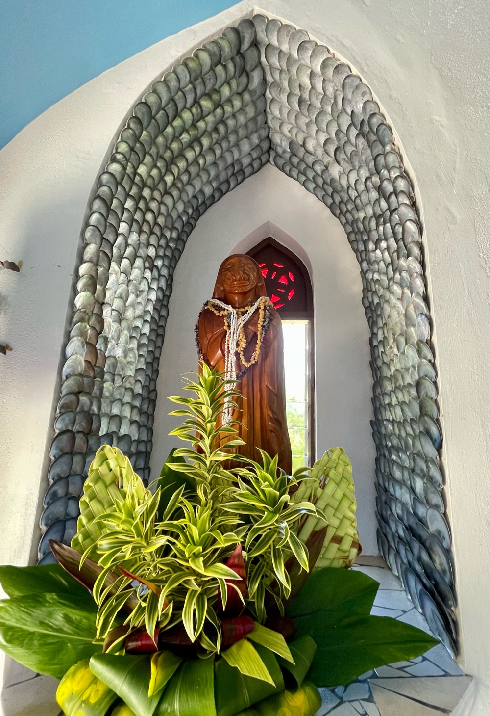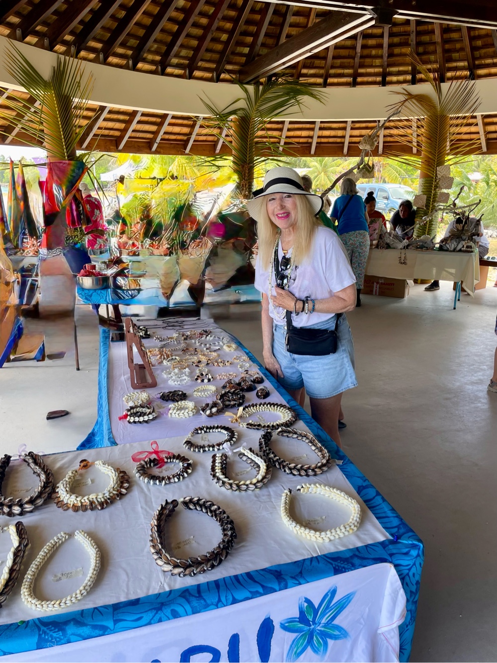 Our first stop was the local handicraft market, small but full of charm with handmade shell jewelry, woven hats, and colorful pareos. From there, we made our way to the Catholic Church — an absolute highlight! The interior is beautifully decorated with seashells of every shape and size, even the chandeliers are crafted from them. Truly one of the most unique and lovingly detailed churches we’ve seen anywhere in the Pacific.