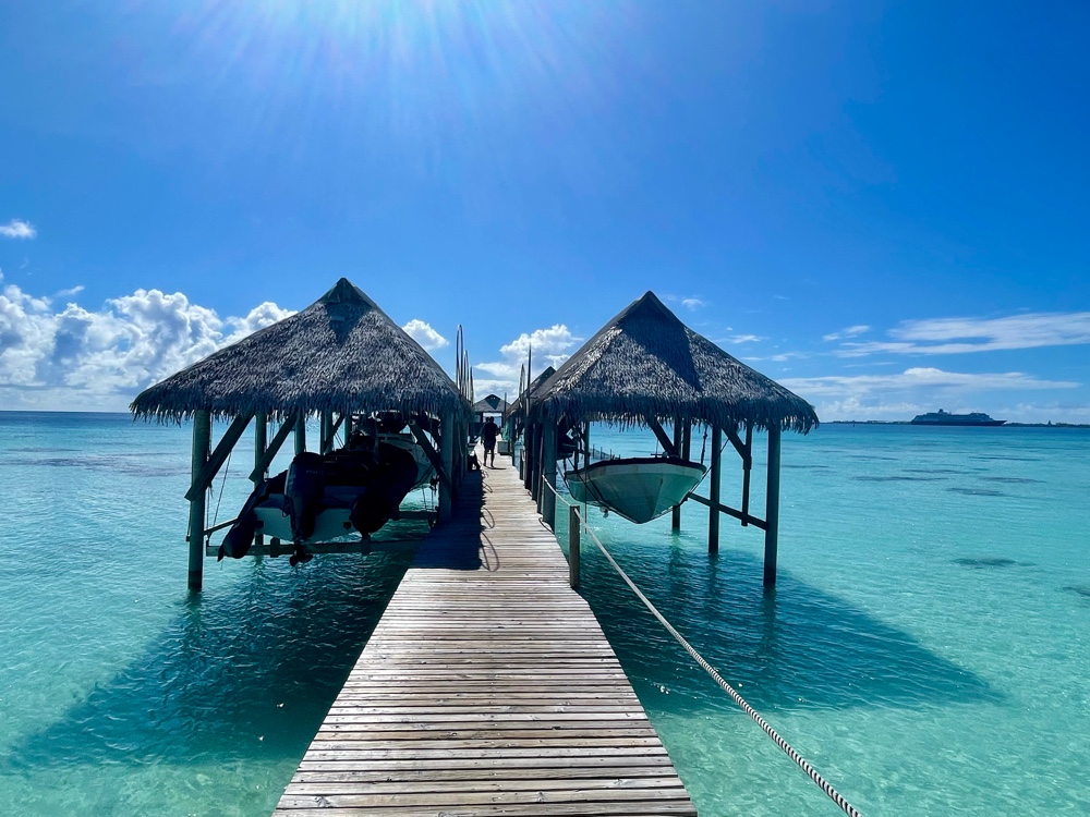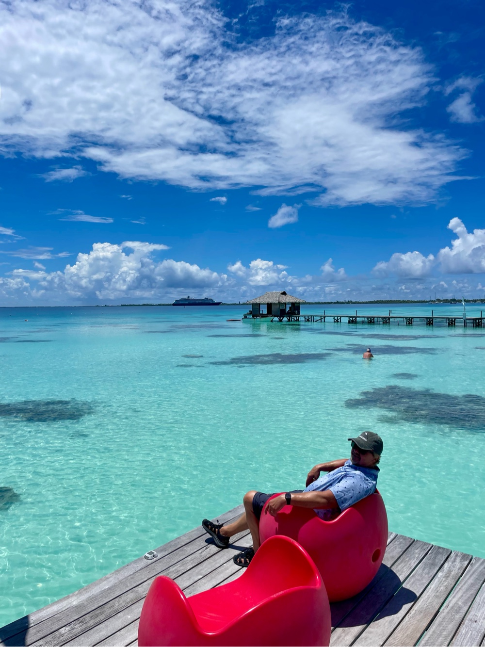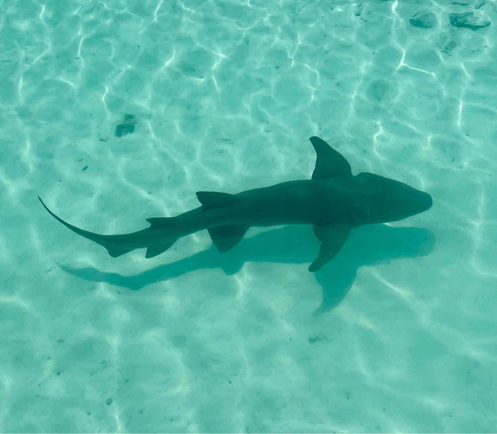 The place was lively, packed with fellow cruise guests and crew, so it almost felt like an extension of our ship, lol. We were invited to join two lovely couples — one from Germany, the other from the Netherlands — whom we’d met earlier in the voyage. Such a nice surprise! Before lunch, we couldn’t resist a dip in the warm turquoise water, followed by a couple of cold beers and some crispy French fries. A few hours melted away between swims, snorkelling sessions, and just soaking up the laid-back island vibe. It’s quite something to be floating along, turn around, and see a six-to-ten-foot shark glide past behind you — a little heart-stopping but thrilling all the same!