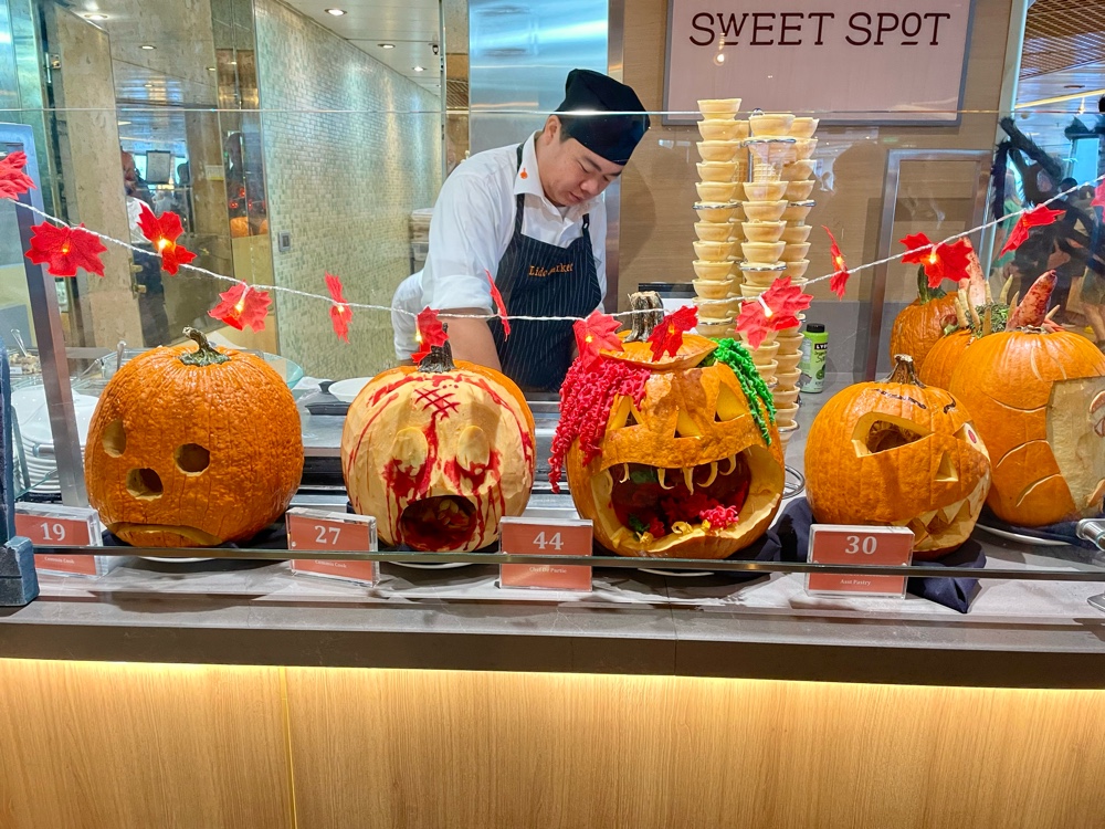 The festivities kicked off with a crew-wide pumpkin carving competition that brought out some serious hidden talent. From servers and waiters to engineers, bartenders, and kitchen staff, everyone got into the Halloween spirit. The Lido deck was lined with over 50 dazzling (and sometimes hilarious) pumpkin creations — everything from classic jack-o’-lantern grins to intricate, ship-themed masterpieces.
