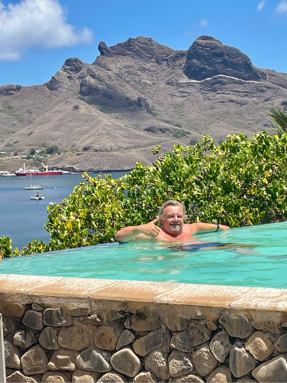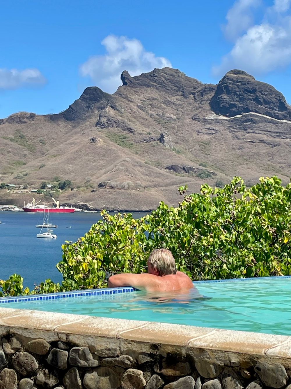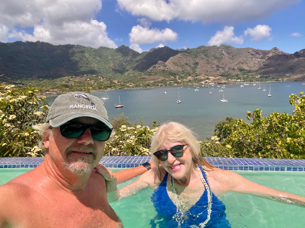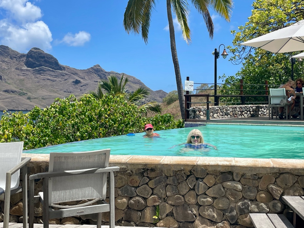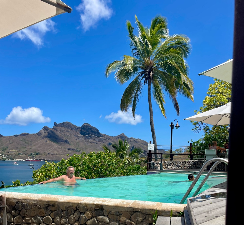 From there, we made our way up the hill to the Le Nuku Hiva Hotel, which offers mountainside bungalows, a French restaurant, and a terrace bar overlooking the bay — complete with an infinity pool. We’d planned ahead, wearing our bathing suits under our clothes and packing towels in our backpack, and it was well worth it. There’s nothing like enjoying a cold beverage and a swim with that view!