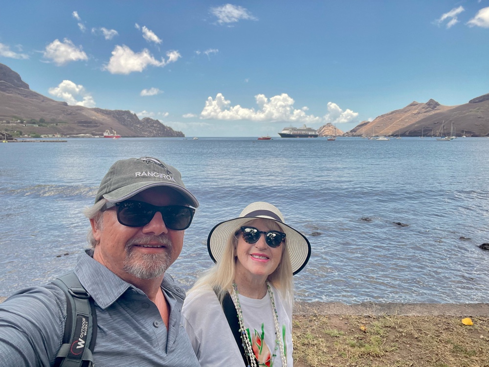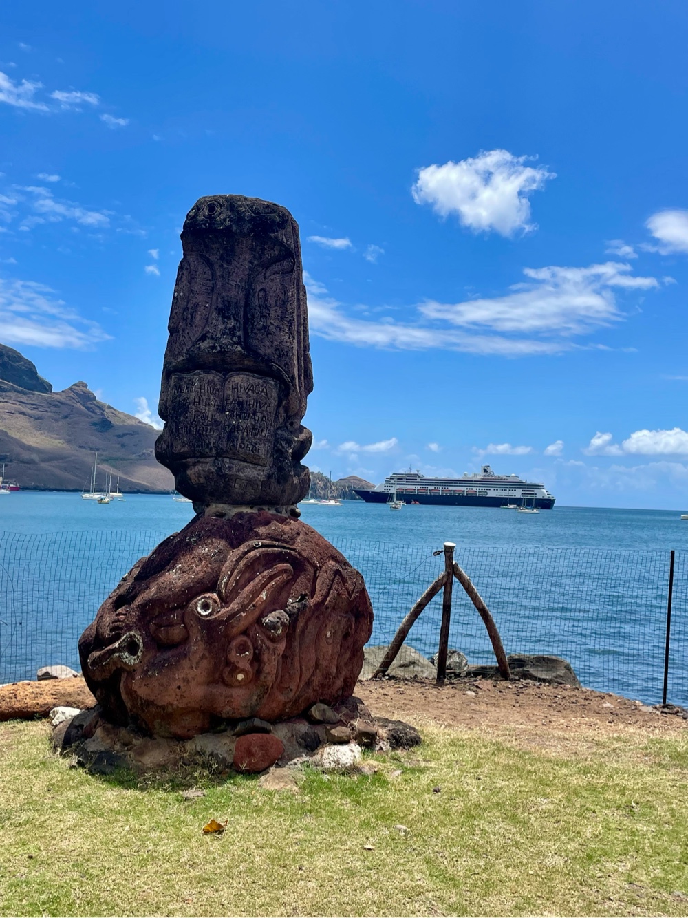 Our stop today brought us back to Nuku Hiva, the largest of the Marquesas Islands in French Polynesia — a remote and rugged beauty that feels both untouched and quietly evolving. The island itself covers about 130 square miles (339 km²) and is home to roughly 3,000 residents, most living around the main village of Taiohae, where the tender brings you ashore. The local economy is built on fishing, small-scale agriculture, and a touch of tourism, with cruise visits like ours adding a gentle rhythm to island life.