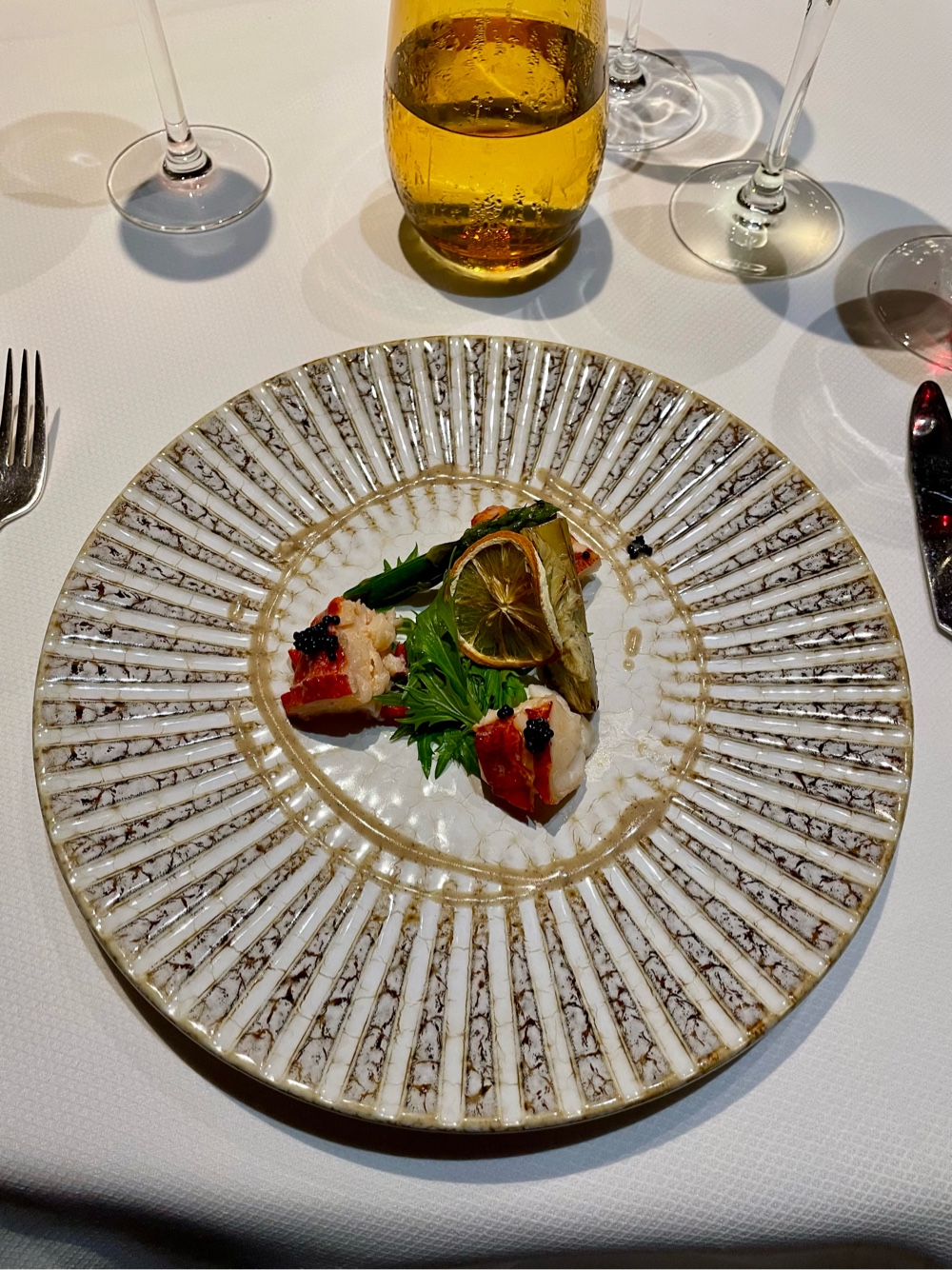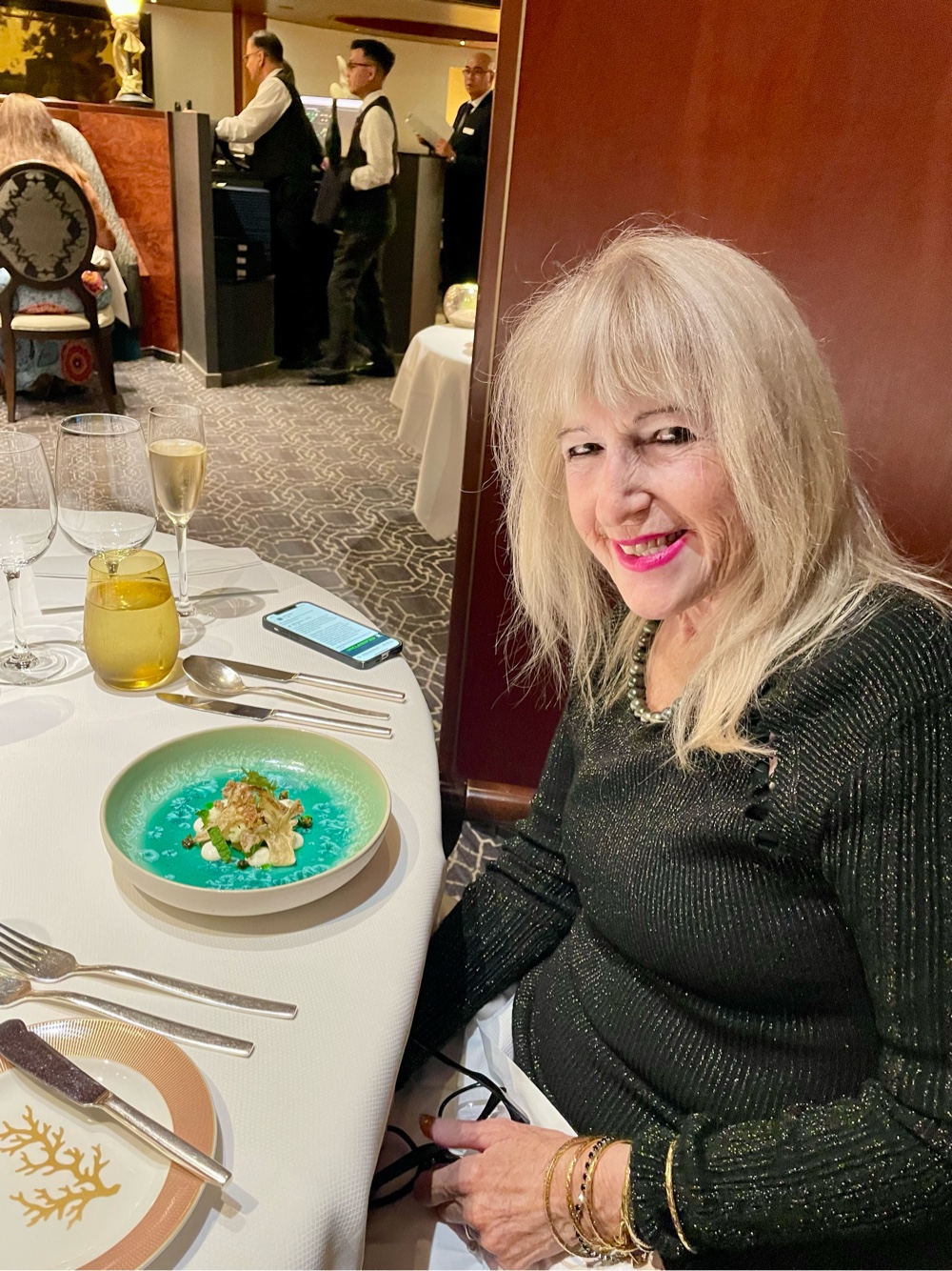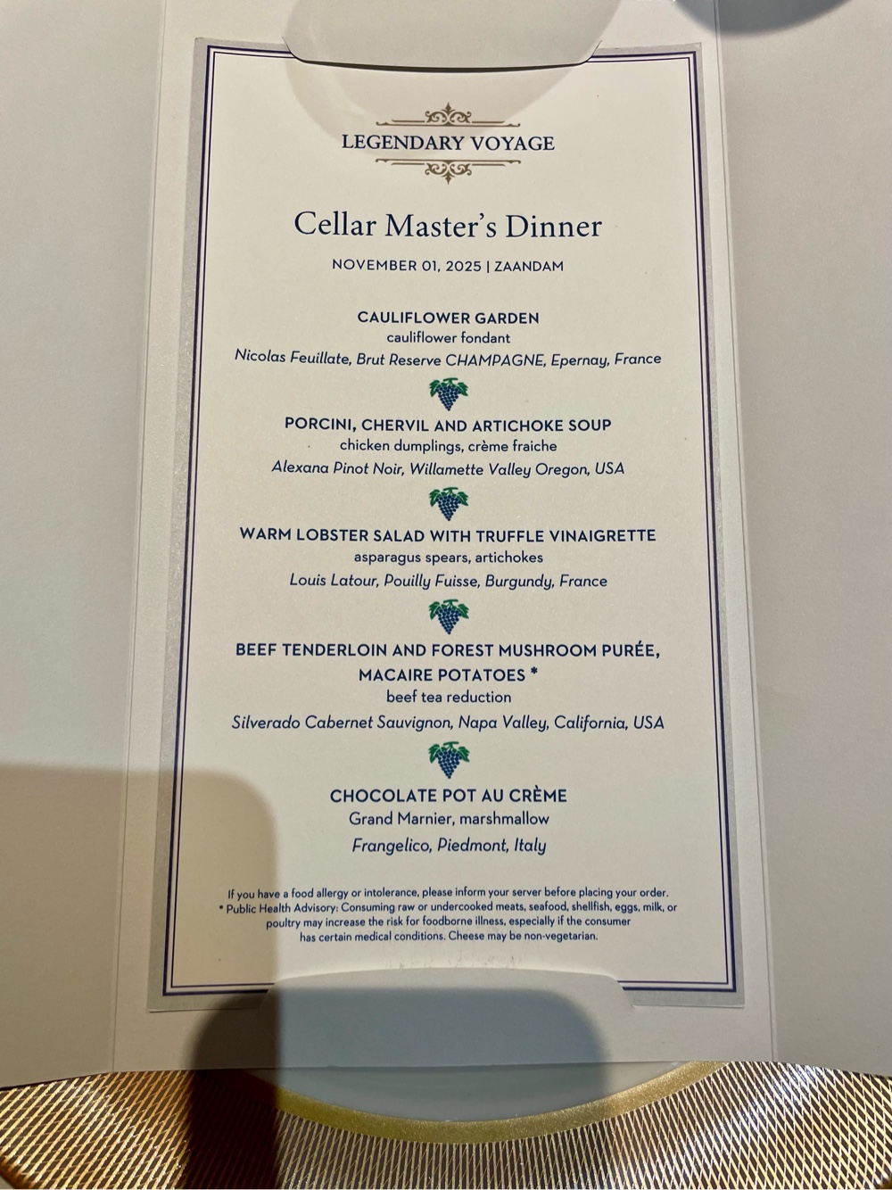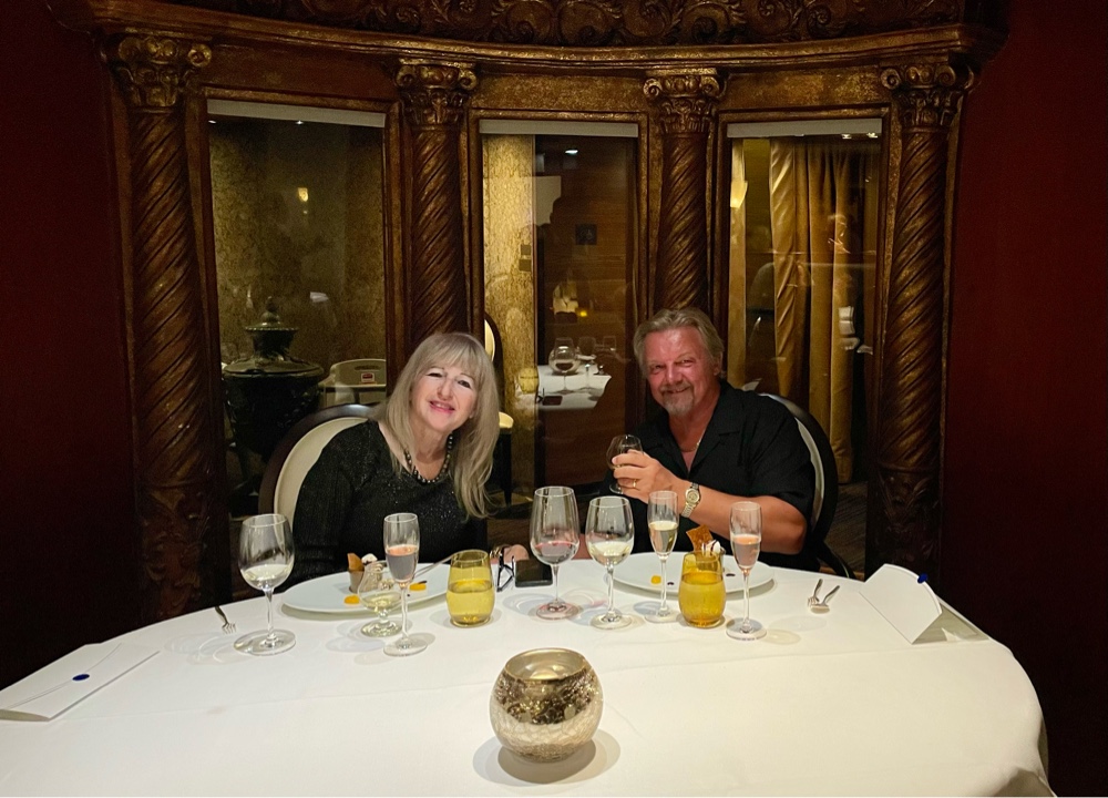 Back onboard, the indulgence continued! Tonight, we attended the Cellar Master’s Specialty Dinner, hosted by the always-wonderful Rod. We knew he’d deliver an amazing evening, and he absolutely did. Each course was beautifully presented and perfectly paired — and yes, of course, we took photos (how could we not?).