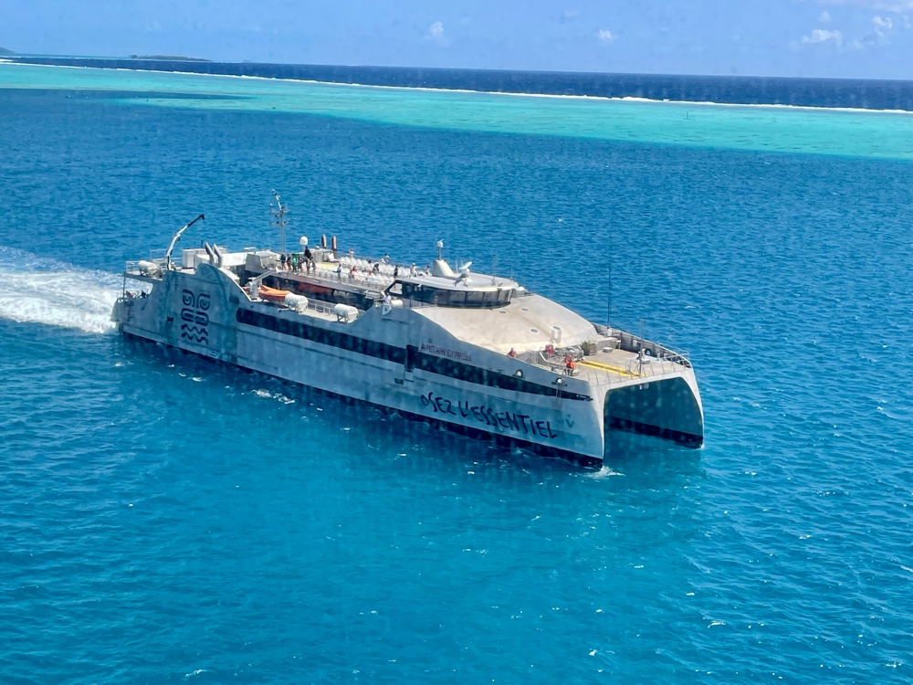 As we set sail later in the day, the ship glided slowly through the lagoon, weaving between Raiatea and its close neighbour, Taha’a. The two islands share the same lagoon and are separated only by a narrow channel, so the scenery along the way was stunning — mountains reflected in turquoise water, small motus dotting the reef, and the light shifting as the sun began to dip lower. The commentary over the loudspeakers described how Raiatea and Taha’a are like twin sisters: Raiatea is the hub, home to the airport, marinas, and main town of Uturoa, while Taha’a is quieter, famous for its vanilla plantations and laid-back charm. It’s easy to see why people often visit both — they really feel like one place, joined by that beautiful lagoon.